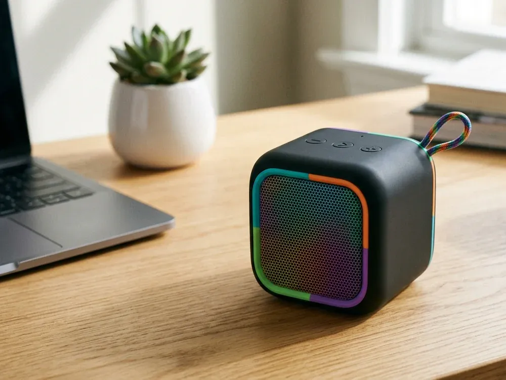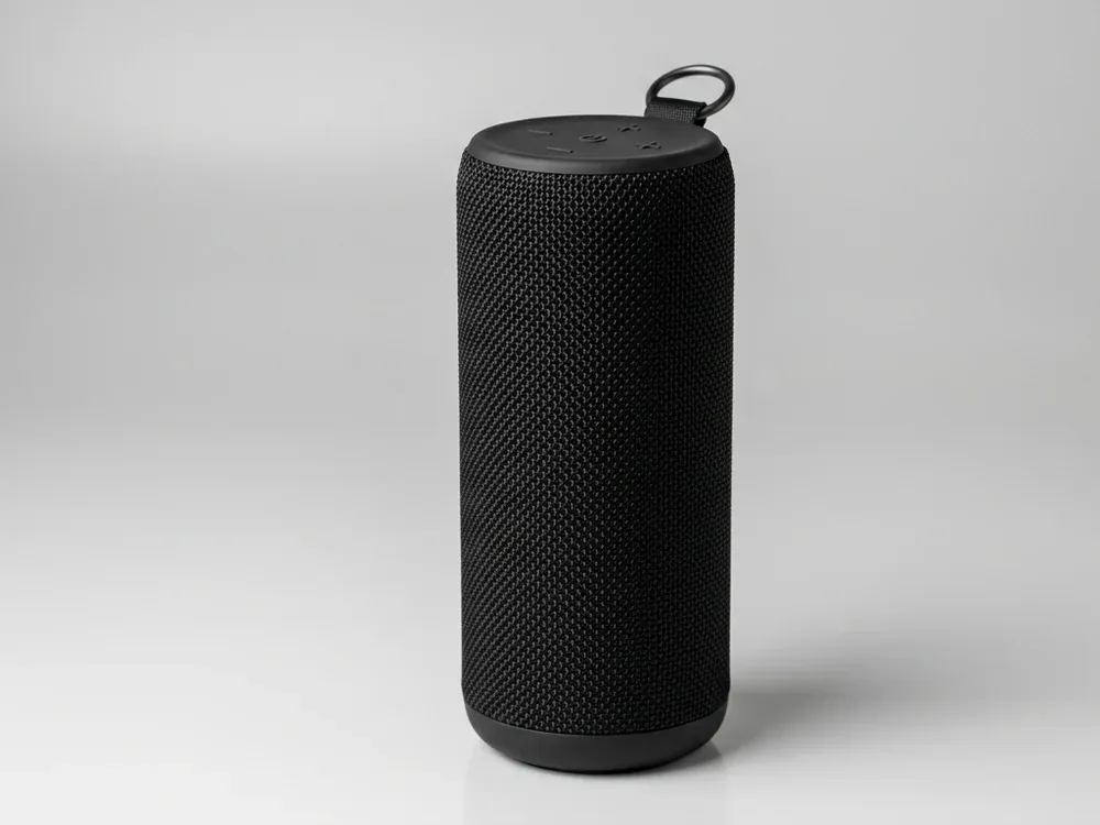 Bluetooth portátil con sonido 360°, resistente a salpicaduras IPX4 y gran área de impresión.